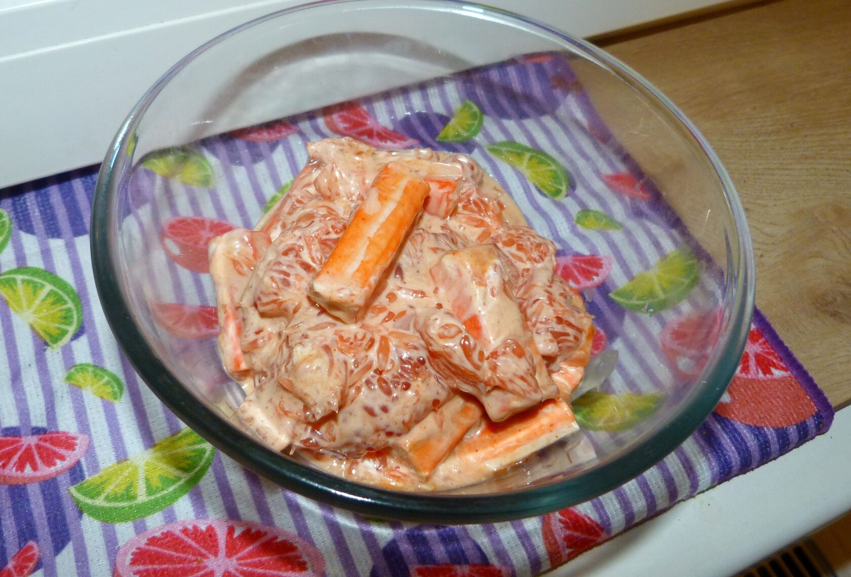 Один из самых безумных по виду салат из моей коллекции - мякоть грейпфрута, с крабовым мясом, под майонезом с кетчупом.