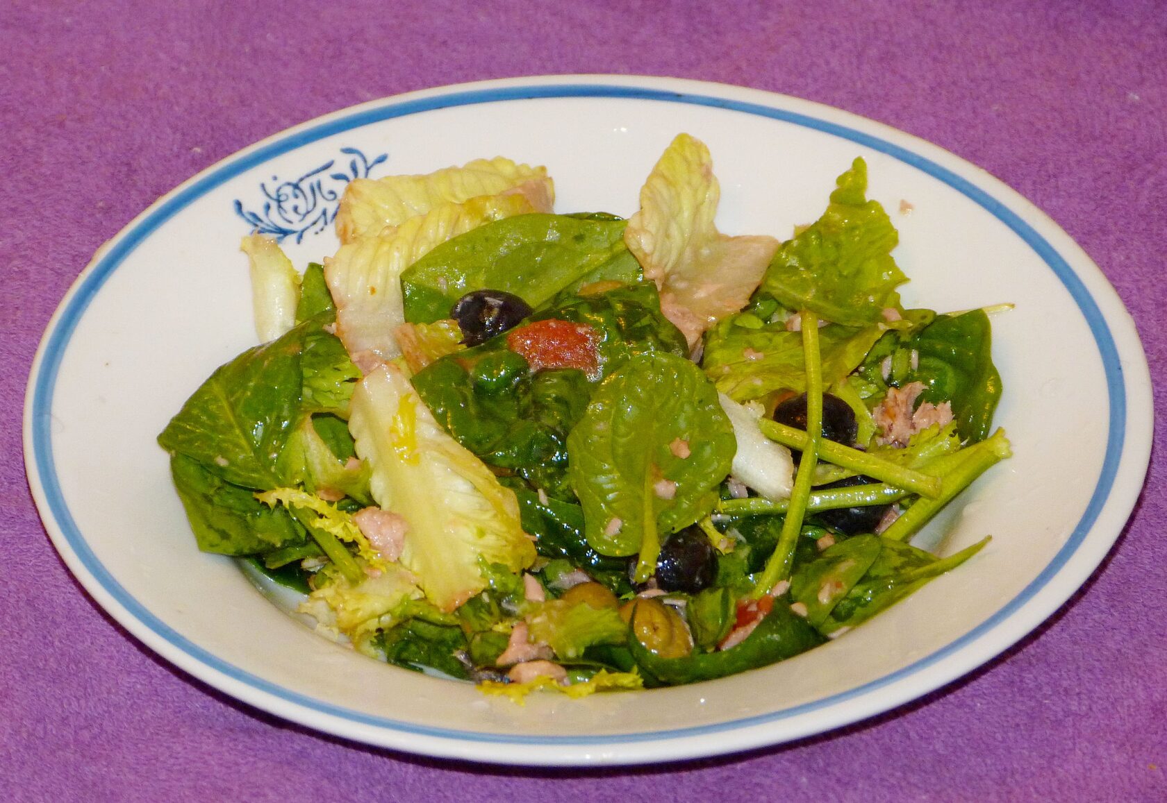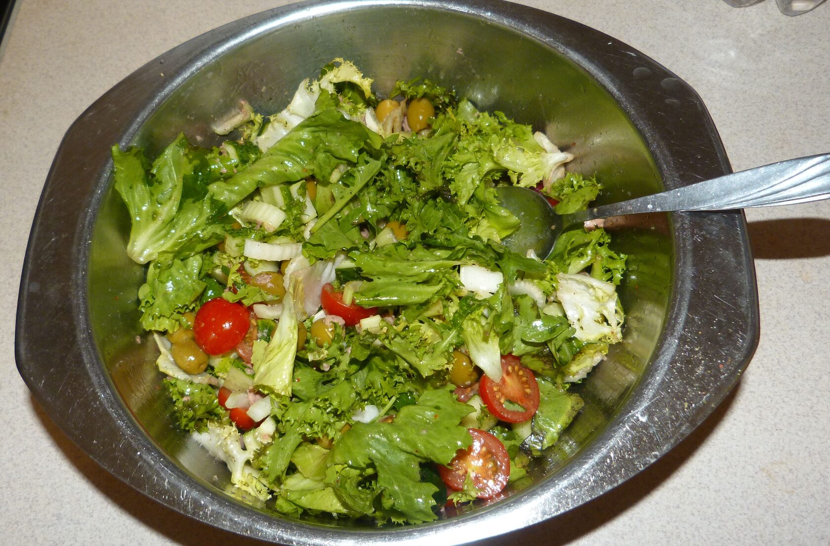 Рецепта определённого нет - какой салат на хозяйстве есть, такой в ход.