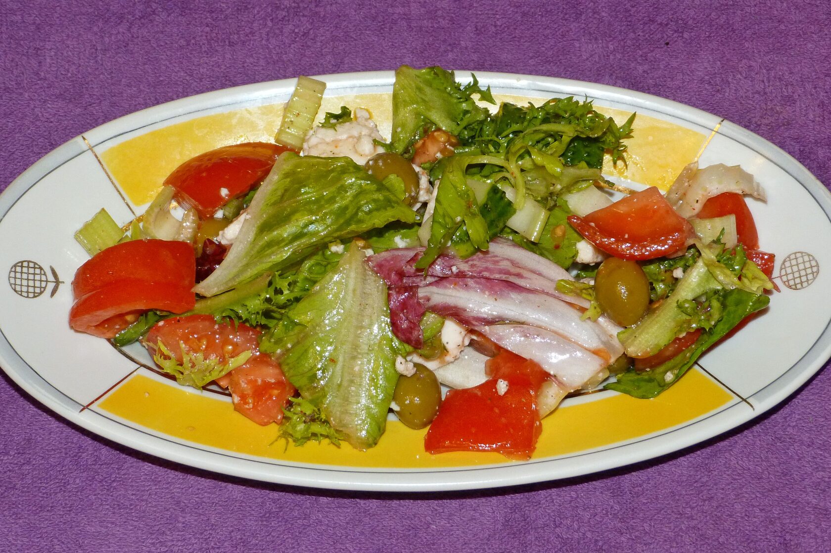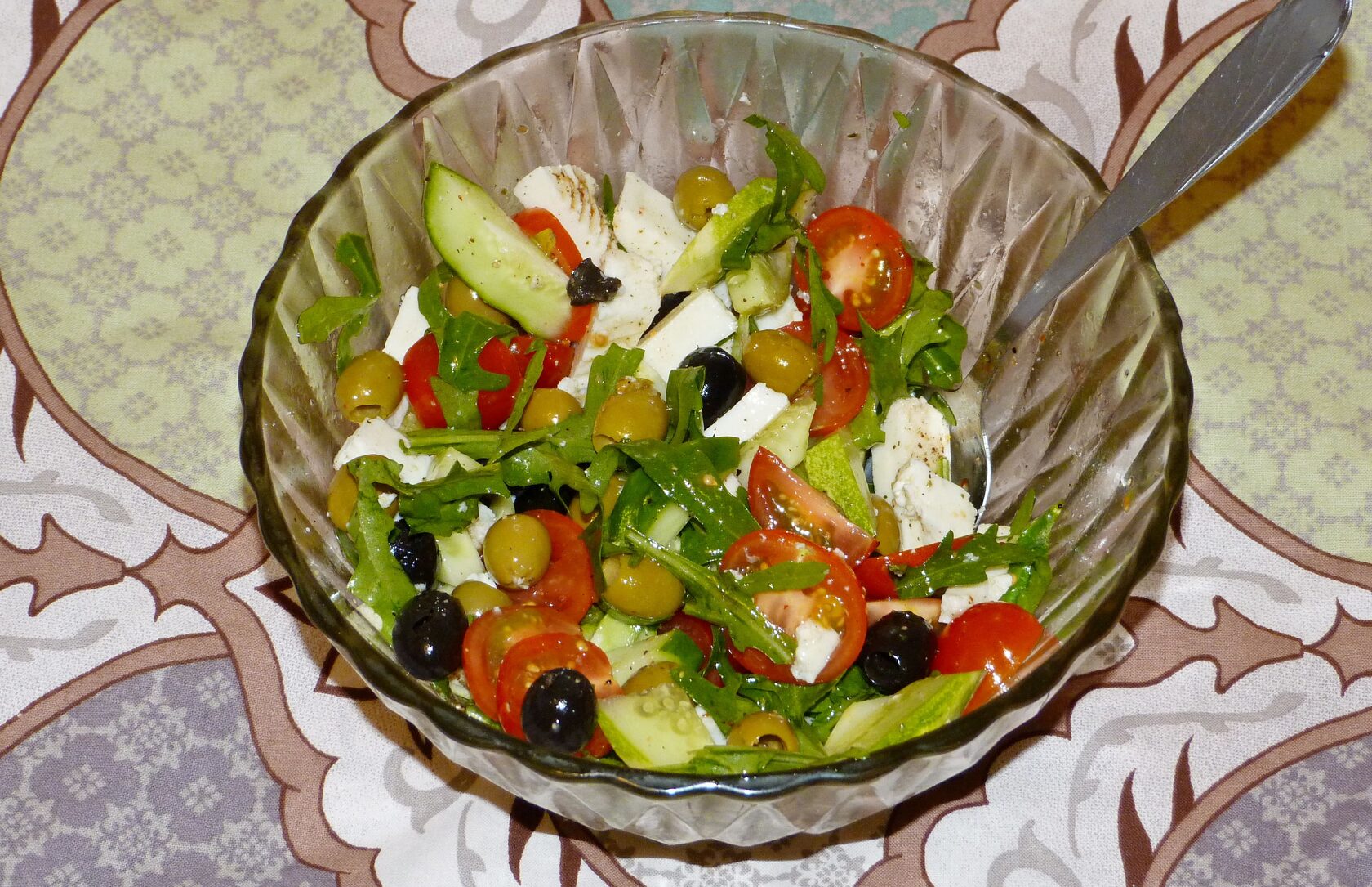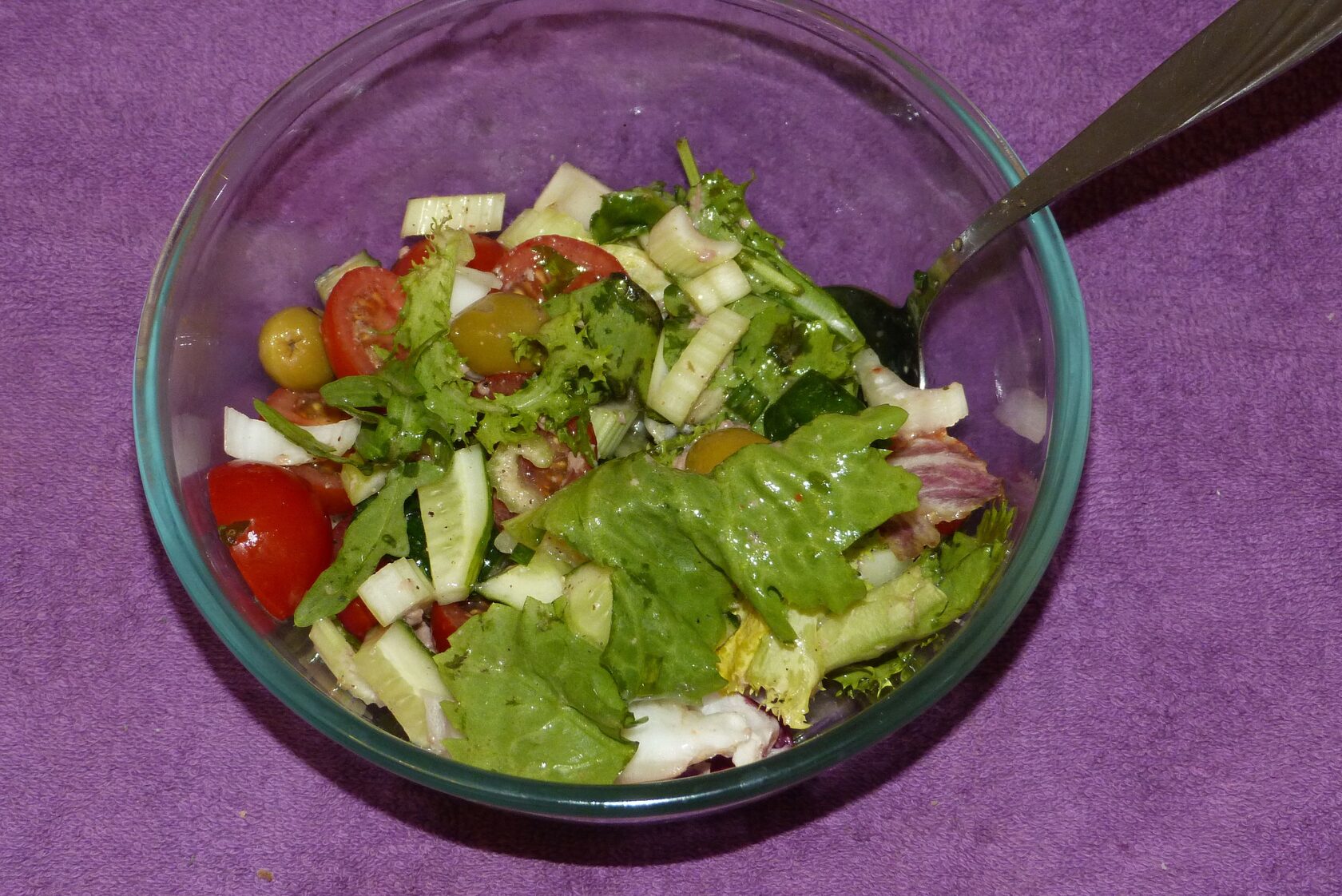 Салат "Фитоняша" - всю зелень, оливки и помидоры кидаешь в один чан, поливая оливковым маслом.